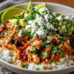 Now it’s time to add the star of the show! Scoop a generous portion of the salsa verde chicken on top of the rice. Let that vibrant green sauce drizzle down the sides, creating a beautiful contrast. This is where the magic begins, and your taco bowls start to come to life!