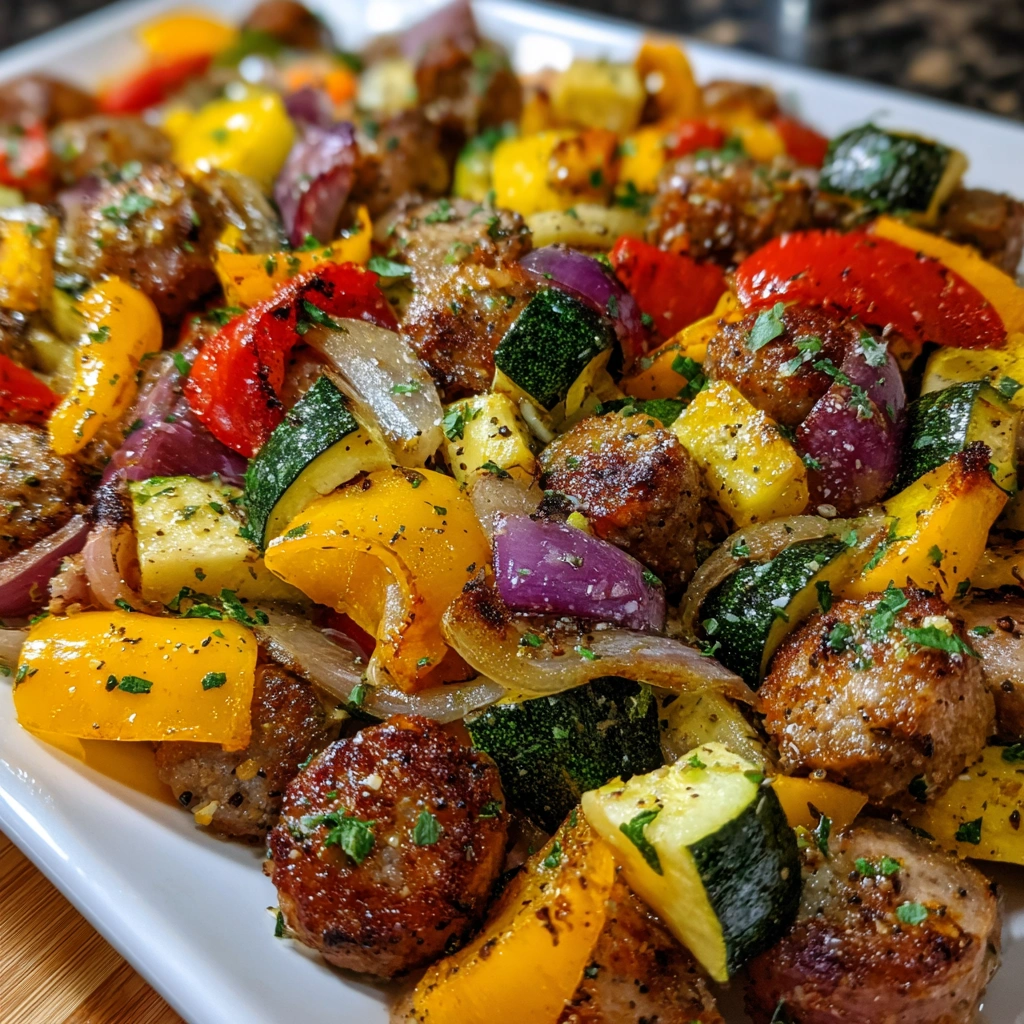 A quick and easy one-pan meal featuring flavorful sausage and a variety of colorful vegetables, perfect for busy weeknights.