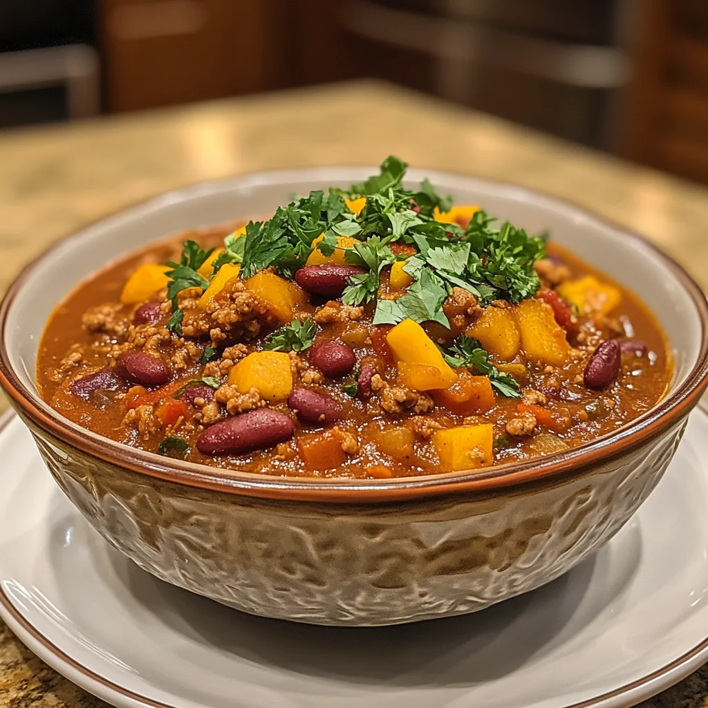 A warm and hearty slow-cooker pumpkin chili perfect for fall, combining the flavors of pumpkin, beans, and spices for a comforting meal.