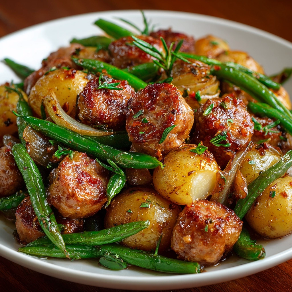 A hearty and comforting dish made with sausage, potatoes, and green beans, all cooked together in a slow cooker for a delicious and easy meal.