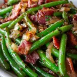A delightful Southern dish featuring crispy bacon and tender green beans sautéed with garlic and onion, creating a perfect balance of flavors.