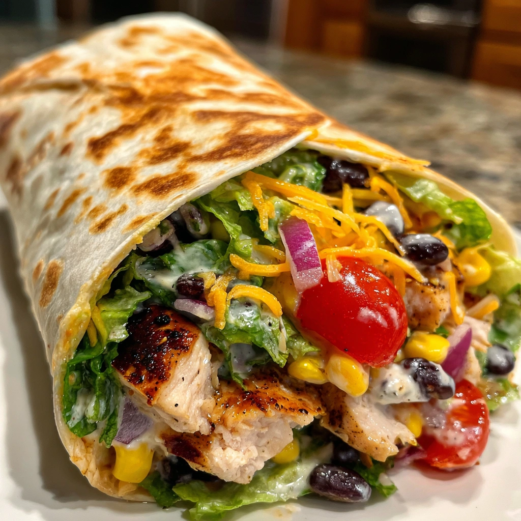 A delicious and quick meal option featuring grilled chicken, fresh vegetables, and a zesty southwest dressing wrapped in a tortilla.