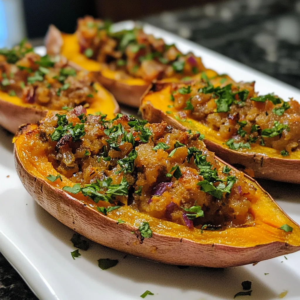 Delicious and healthy stuffed sweet potato skins filled with a savory mixture, perfect for a snack or appetizer.