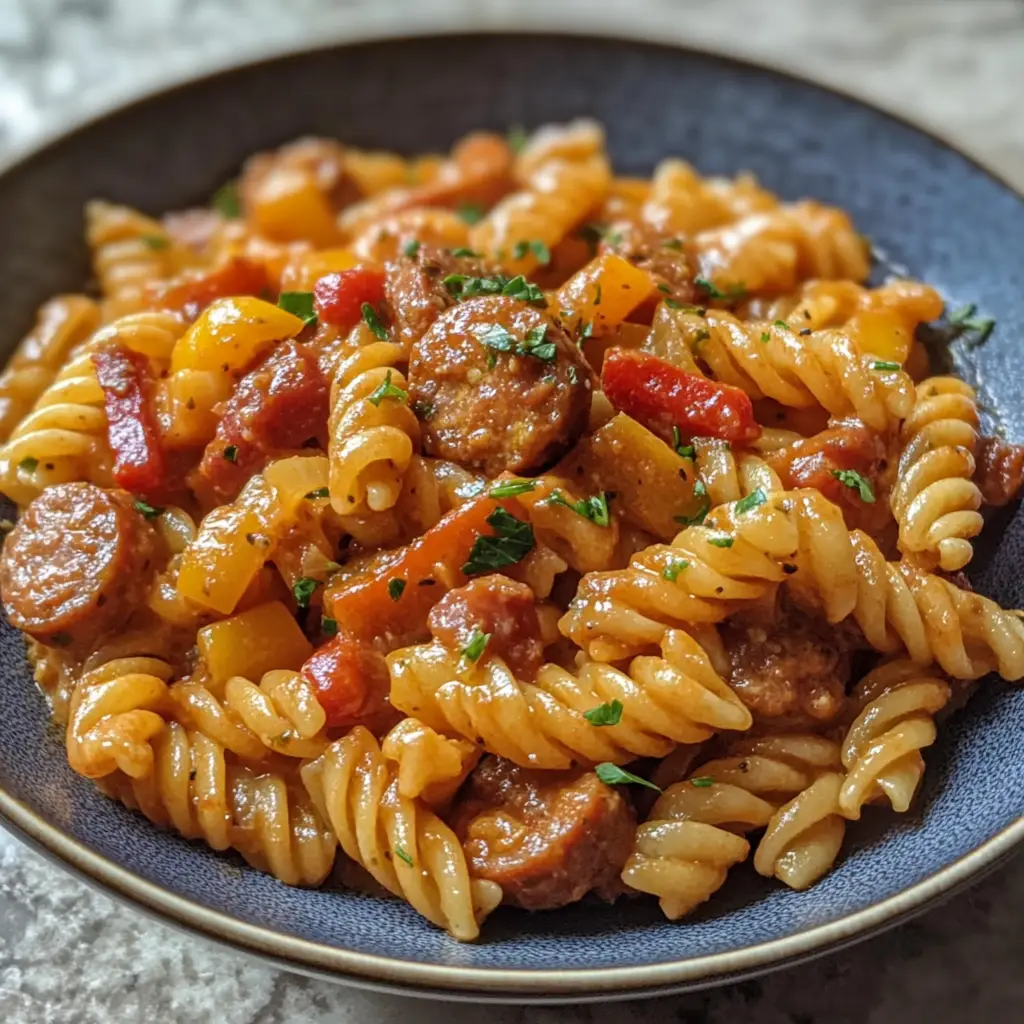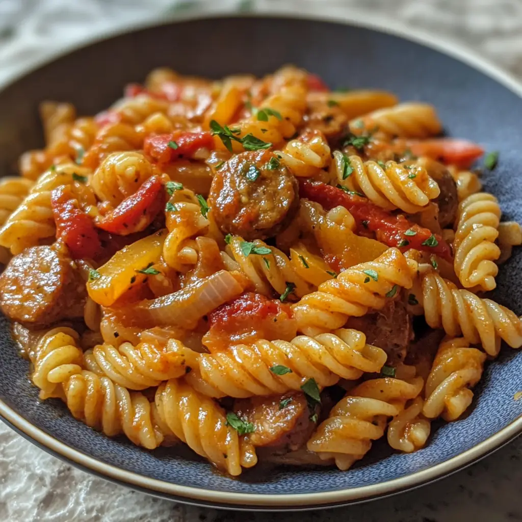 A delicious and hearty pasta dish featuring sweet peppers and sausage, perfect for a comforting meal.
