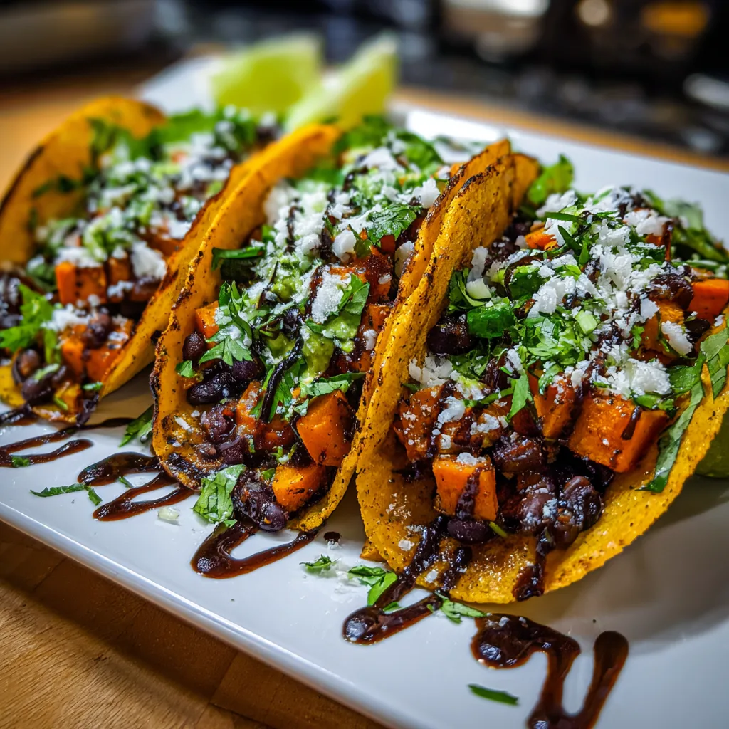Sweet Potato & Black Bean Tacos are a delicious and nutritious meal option, combining the sweetness of roasted sweet potatoes with the hearty texture of black beans, all wrapped in a warm tortilla.