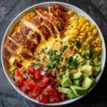 Now comes the fun part—toppings! Sprinkle diced tomatoes over the cheese layer, followed by a generous handful of corn. The sweetness of the corn pairs beautifully with the savory chicken. Next, add your avocado slices, which bring a creamy richness to the dish. Finally, finish with a sprinkle of chopped cilantro for a fresh, vibrant touch. These toppings not only add flavor but also make your Taco Queso Chicken Cottage Cheese Bowls visually appealing!