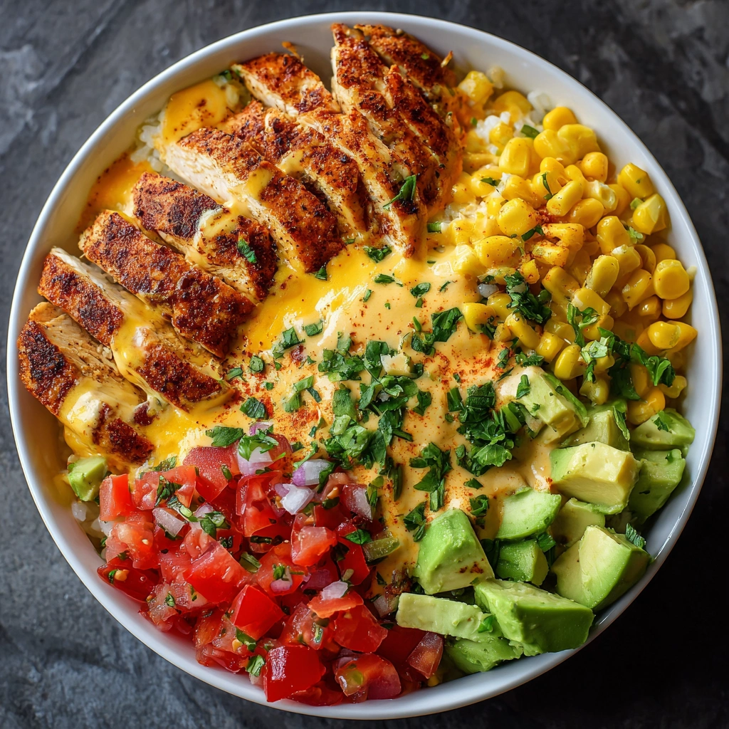 - Top with diced tomatoes, corn, avocado slices, and chopped cilantro.