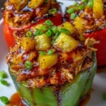 A vibrant and flavorful dish featuring bell peppers stuffed with juicy chicken, sweet pineapple, and rich teriyaki sauce, creating a Hawaiian-inspired culinary experience.